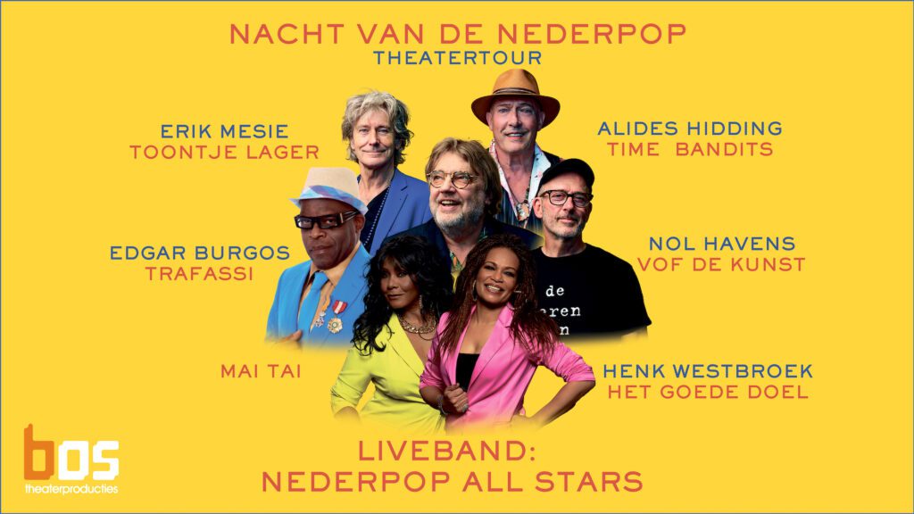 Beleef van januari t/m maart 2026 de grootste Nederpophits door de originele zangers tijdens de Nacht Van De Nederpop! De Nederpop All Stars nemen de grote namen achter de Nederpop mee voor een knallend feest! De boegbeelden van Het Goede Doel, The Time Bandits, Toontje Lager, VOF de Kunst, Trafassi en Mai Tai storten een denderende waterval aan hits uit onder de zinderende begeleiding van de band Nederpop All Stars!
